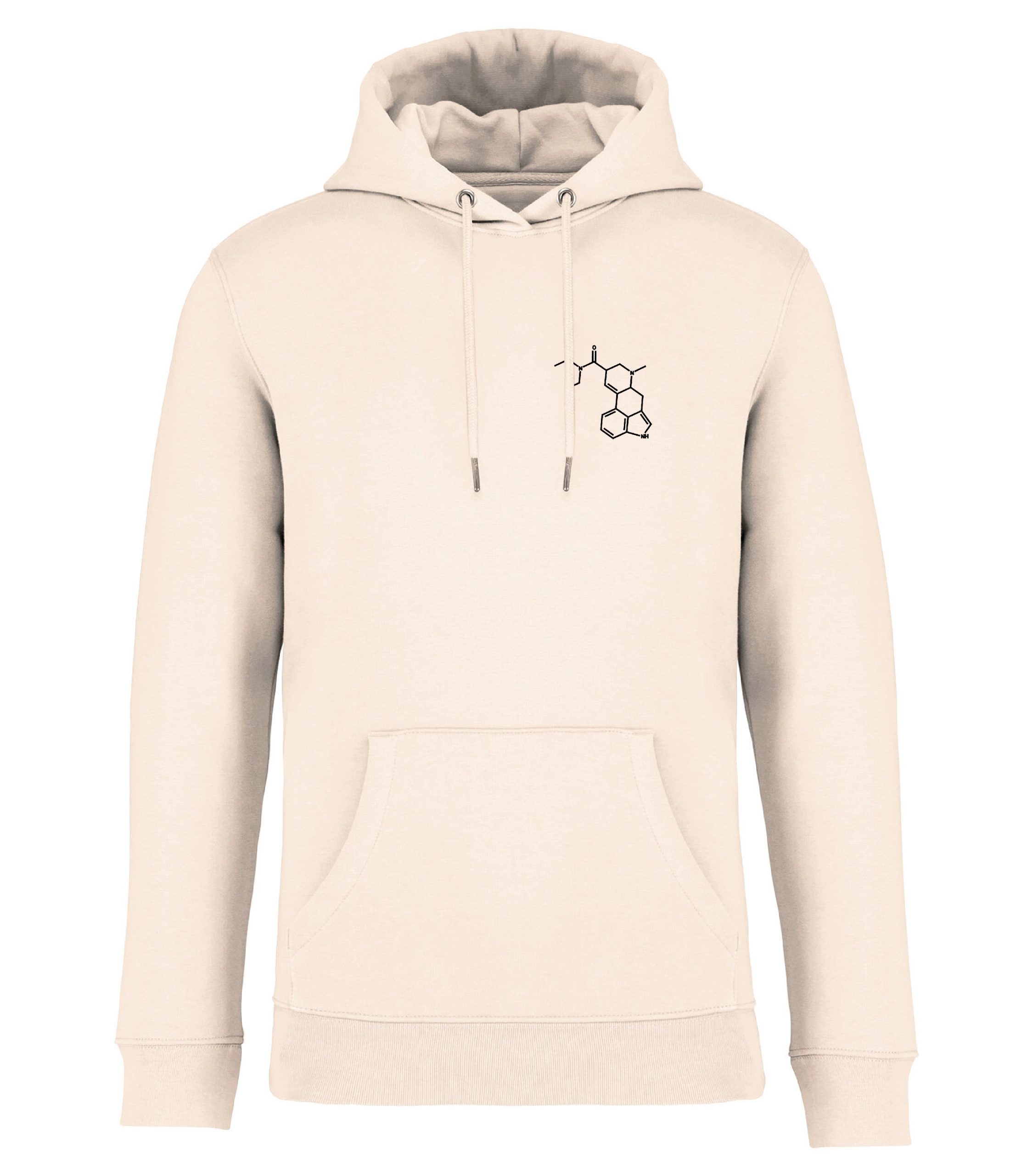 Unisex hoodie tillverkad av ekologisk ringspunnen kammad bomull och återvunnen polyester. 3 lagers borstat LSF-behandlat (Low Shrinkage Fleece: pre-shrunk fleece) tyg. Rak modell. Fodrad huva med dragsko. Runt dragsko med spetsar och öljetter av återvunnen metall. Känguruficka. 1×1 ribbstickning vid nederkant och ärmslut. Dubbla översömmar på ärmslut, ärmhål och nederkant. Halvmåne bak och inre tejpad hals för ökad komfort.